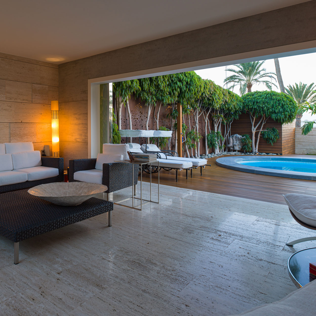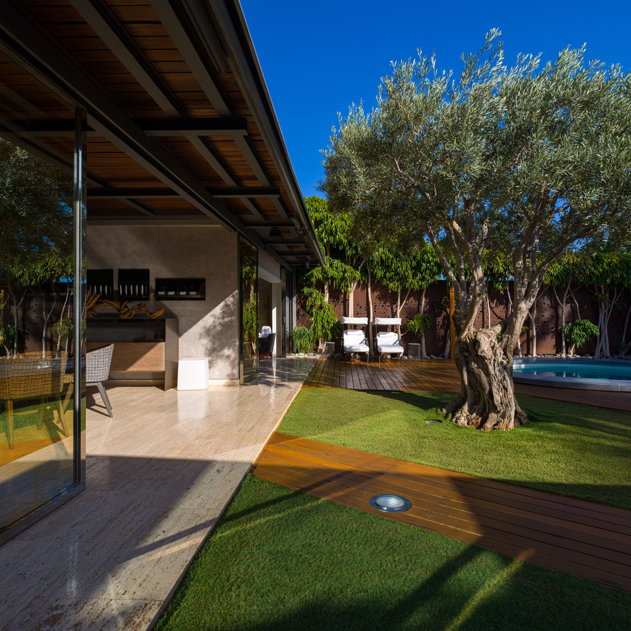 Construida sobre un terreno de 750 metros cuadrados, la villa abarca 320 de ellos, divididos en zonas distintivas que fluyen sin interrupción entre el interior y el exterior. El diseño busca la armonía entre ambos espacios, logrando una simbiosis perfecta.